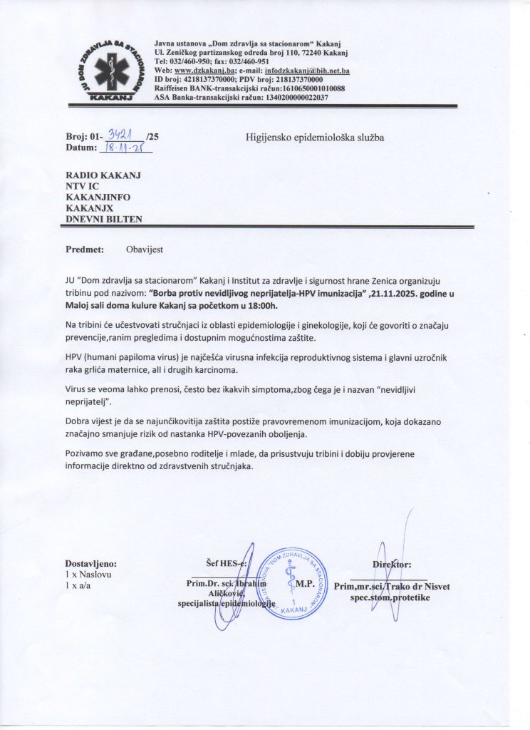 OBAVIJEST O ODRŽAVANJU TRIBINE POD NAZIVOM “BORBA PROTIV NEVIDLJIVOG NEPRIJATELJA-HPV IMUNIZACIJA”