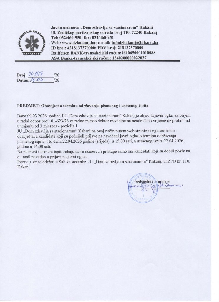 OBAVIJEST O TERMINU ODRŽAVANJA PISMENOG I USMENOG ISPITA-POZICIJA 1