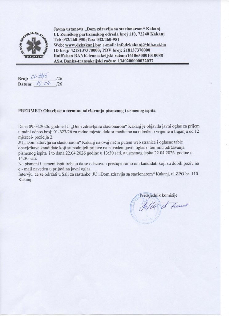 OBAVIJEST O TERMINU ODRŽAVANJA PISMENOG I USMENOG ISPITA-POZICIJA 2