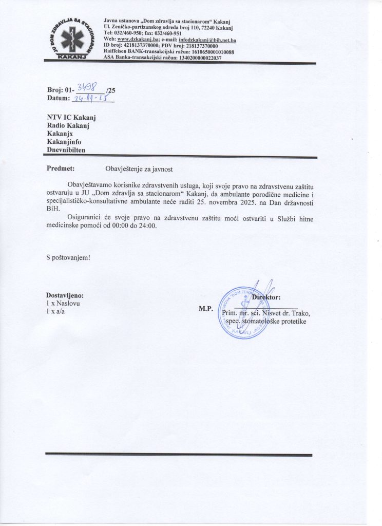 OBAVJEŠTENJE ZA JAVNOST POVODOM NERADNOG DANA 25.11-DANA DRŽAVNOSTI BiH